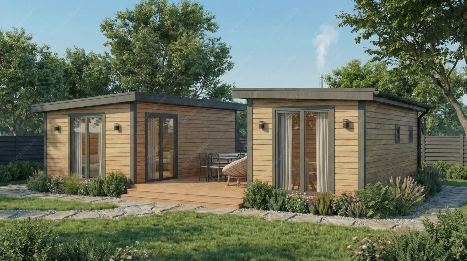 Баня «Эспера» реализует уникальную архитектурную концепцию, где открытая терраса становится центральным связующим звеном между двумя автономными блоками. Такое решение создает исключительную многофункциональность, позволяя одновременно использовать пространства для разных сценариев: шумного отдыха на просторной террасе (23,55 м²) и уединенного расслабления в одном из помещений.  Планировка демонстрирует чёткое функциональное зонирование. Один закрытый блок объединяет большую гостевую комнату (19,38 м²) и санузел, что идеально для приема компании. Второй блок целиком посвящен банным процедурам: здесь расположена светлая парная (5,4 м²) с двумя окнами-форточками, отдельная помывочная и своя компактная комната отдыха. Односкатная крыша и общие габариты 6х11 метров формируют современный, выразительный облик строения.  Использование натуральной древесины и качественный конструктив обеспечивают эффективное теплоудержание и долговечность. Проект «Эспера» предлагает редкий формат — это не просто баня, а целый гостевой комплекс с выделенной релаксационной зоной под открытым небом, где каждая деталь работает на создание атмосферы полного отрыва от городской суеты.