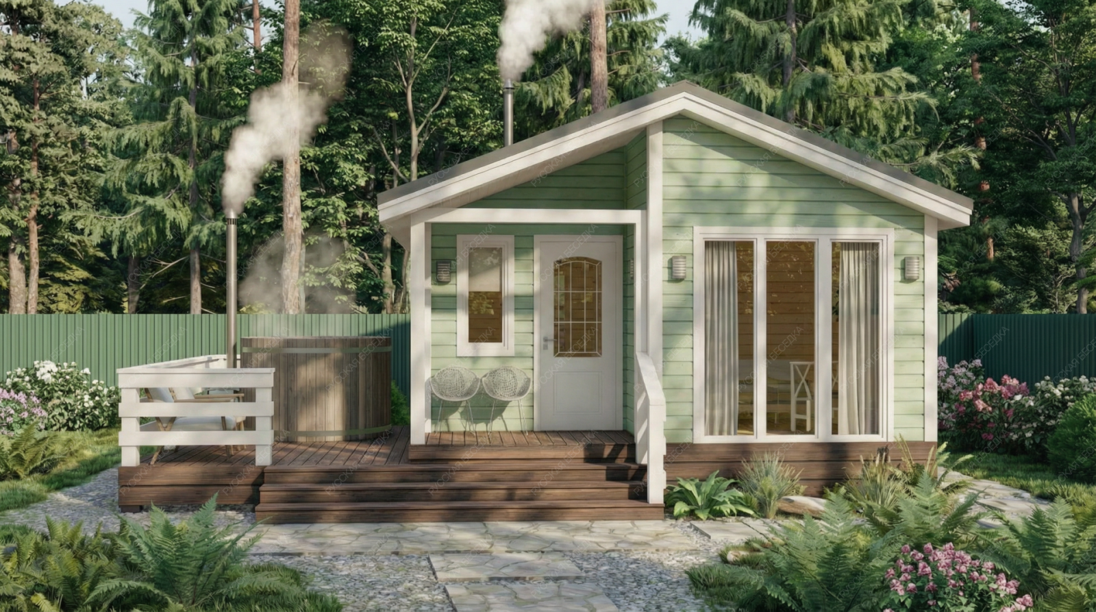 Баня «Фиоре» сочетает в себе классическую архитектуру с двускатной крышей и исключительно удобную планировку, где каждая деталь направлена на создание комфортной среды. Просторная открытая терраса площадью 13,28 м² органично дополняет ансамбль, предлагая место для отдыха на природе после банных процедур.  Внутреннее пространство отличается тщательным зонированием. Уютный тамбур и крыльцо создают переходную буферную зону, сохраняя тепло. Основной акцент сделан на комфортном отдыхе: просторная комната (11,86 м²) подходит для приема гостей, а наличие отдельного санузла повышает автономность строения. Функциональная парная (5,57 м²) с окном-форточкой и изолированная помывочная обеспечивают гигиеничность и правильный банный микроклимат.  Надежная двускатная конструкция крыши и качественная древесина гарантируют долговечность постройки и оптимальное теплосбережение. Продуманная компоновка помещений и солидные габариты (5,5х6,5 м) делают баню «Фиоре» готовым решением для создания полноценного оздоровительно-релаксационного комплекса на частном участке.