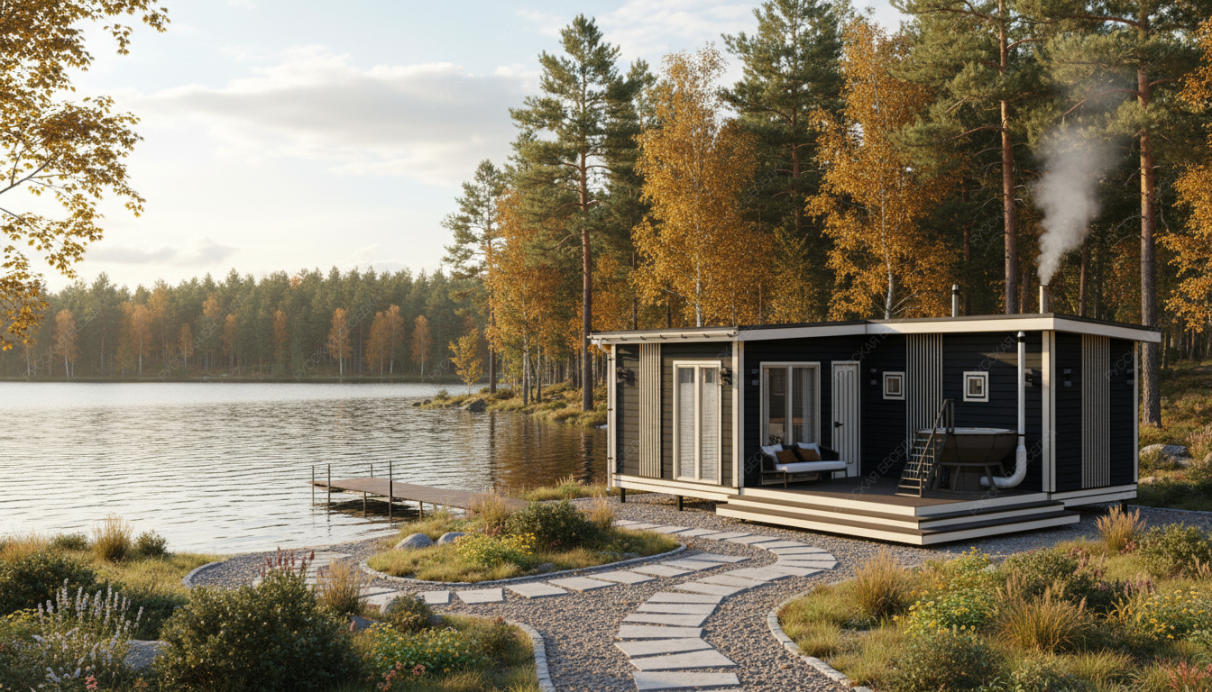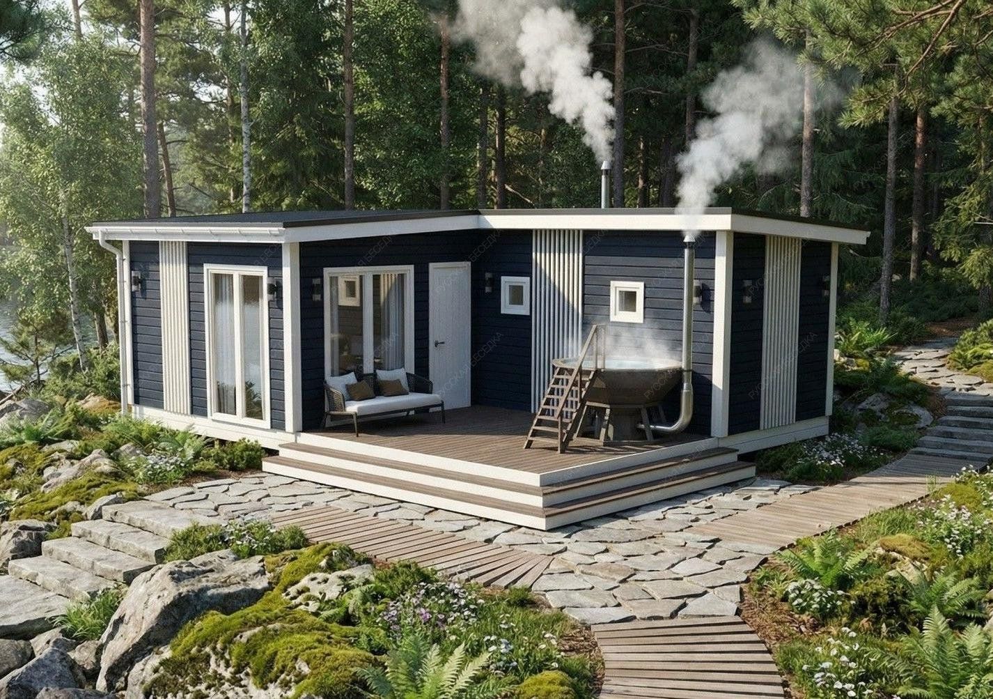 Баня «Монреаль» воплощает концепцию гармоничного пространства, где каждая зона спроектирована для максимального комфорта и расслабления. Обширная открытая терраса площадью 13,28 м² является ключевым элементом архитектуры, плавно продолжая внутреннее пространство и создавая идеальную площадку для отдыха на свежем воздухе, где отлично может расположиться традиционный банный чан для контрастных водных процедур.  Внутренняя планировка отличается продуманной логистикой и комфортом. Просторная комната отдыха (15,9 м²) легко трансформируется в гостиную или столовую, вмещая большую компанию. Функциональная парная (4,83 м²) с деревянным окном-форточкой обеспечивает правильный температурный режим, а отдельная помывочная (3,06 м²) и санузел повышают уровень бытового удобства, делая строение полностью автономным. Односкатная крыша и солидные габариты (5,95х7,5 м) формируют современный, лаконичный экстерьер.  Качественный конструктив из отборной древесины гарантирует долговечность и отличные теплосберегающие свойства. Этот проект предлагает не просто баню, а целый гостевой павильон с акцентом на размеренный отдых и общение, где детали работают на создание завершенной атмосферы загородного релакса.