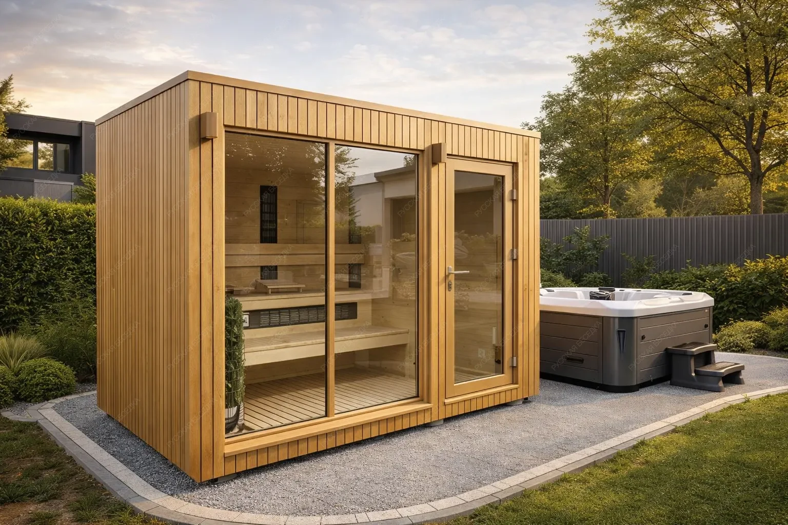 Модульная баня «Гуда» площадью 12 кв.м. с односкатной крышей является воплощением концепции чистого функционала, где всё пространство габаритами 3х4 метра отведено под парную. Её архитектурная идея — создать максимально концентрированную среду для глубокого прогрева и релаксации, идеально подходящую для оборудования в качестве финской сауны с электрокаменкой или современной инфракрасной кабины. Ключевым элементом, формирующим атмосферу, выступает панорамное окно, стирающее визуальную преграду с ландшафтом и наполняющее компактный объём светом. Односкатная крыша придает объекту строгий современный силуэт, а модульная конструкция гарантирует исключительную скорость монтажа на подготовленном месте. Это решение предлагает готовую инфраструктуру для личного спа-ритуала, где нет ничего лишнего, а акцент смещён на качество процедуры, технологичность оборудования и полное единение с природой через панорамное остекление.