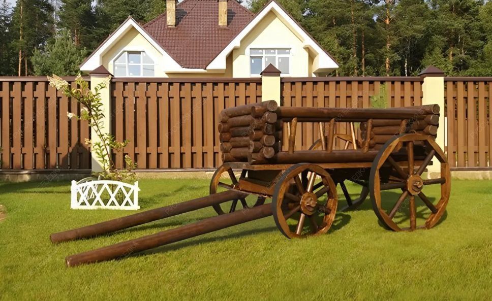 Деревянная четырехколесная бричка для декора загородного участка – замечательный элемент, концентрирующий на себе восторженные взгляды. Это изделие имеет древние корни, раньше представляя собой настоящую конструкцию для лошади с целью перевозки груза. Сегодня же задача деревянной тележки – украшать собой сад. Ее декорируют цветами и растениями, кладут в нее сено, ставят садовые фигурки. Рядом можно поставить и другие изделия из дерева, например, декоративный колодец или мельницу, а если вблизи пруд – и декоративный мостик. Такие ландшафтные изыскания достигают главной цели – радуют собой окружающих, которым невероятно комфортно находится в такой шикарной, наполненной натуральными материалами, обстановке.