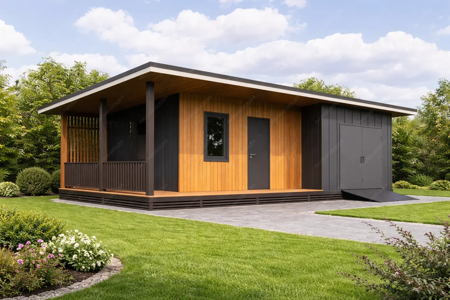 Конструкция изготовлена из хвойных пород древесины (ель, сосна). Материал — массив сухой строганый камерной сушки. *возможна замена на клееный брус
