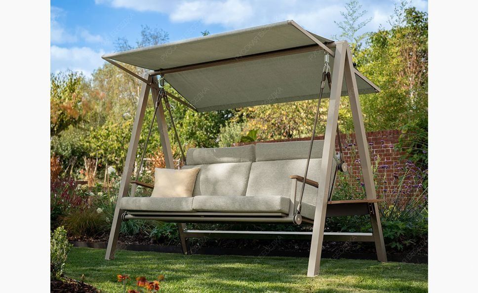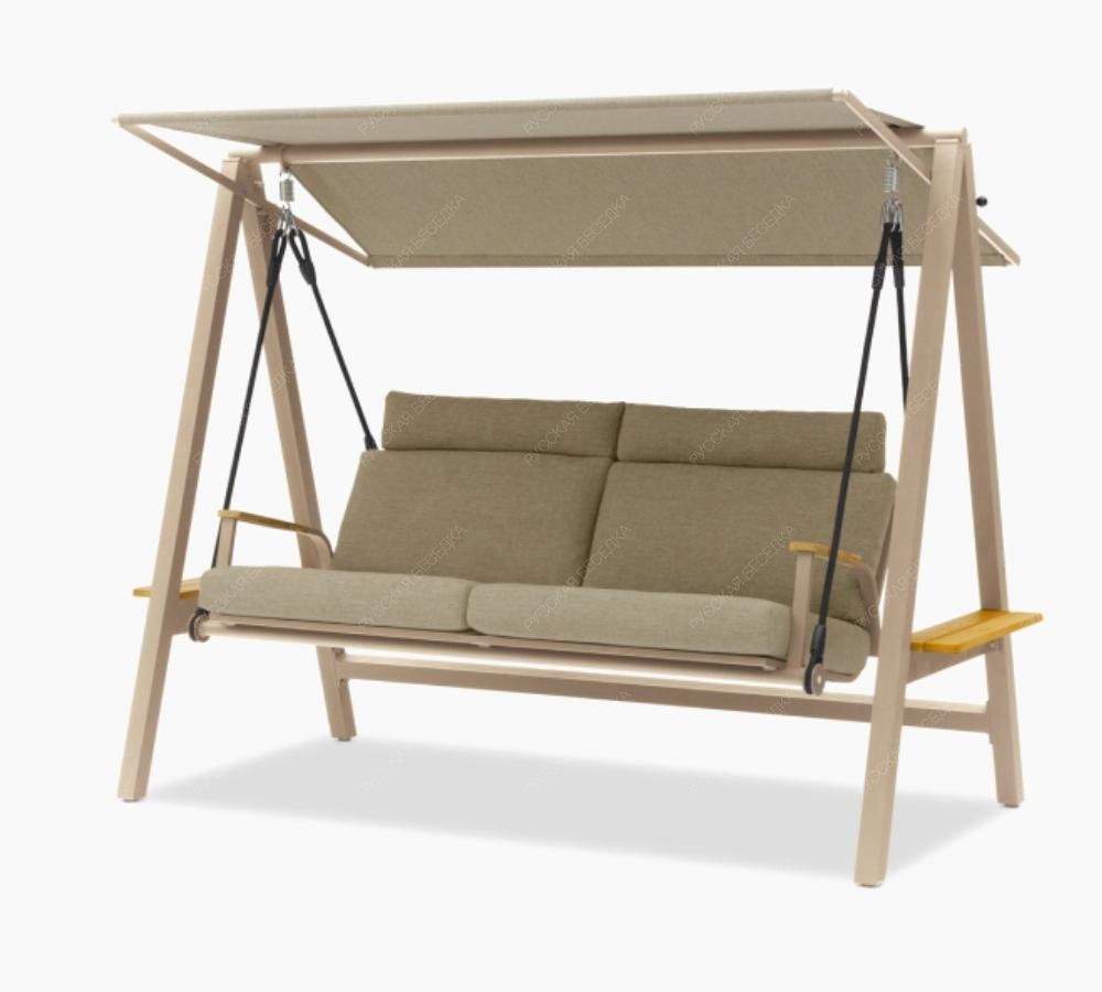 Боковой столик из тикового дерева с обеих сторон качелей.