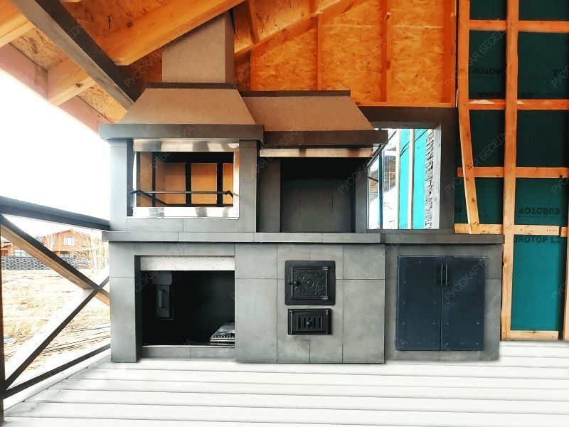 В стандартном варианте отделка столешницы, вертикальных колонн и горизонтальных полос выполнена из керамогранитной плиткой, а труба, крыша и стены - из мраморной крошкой. Ниша для дров темно-коричневого цвета - без отделки. Задняя часть барбекю - без отделки.