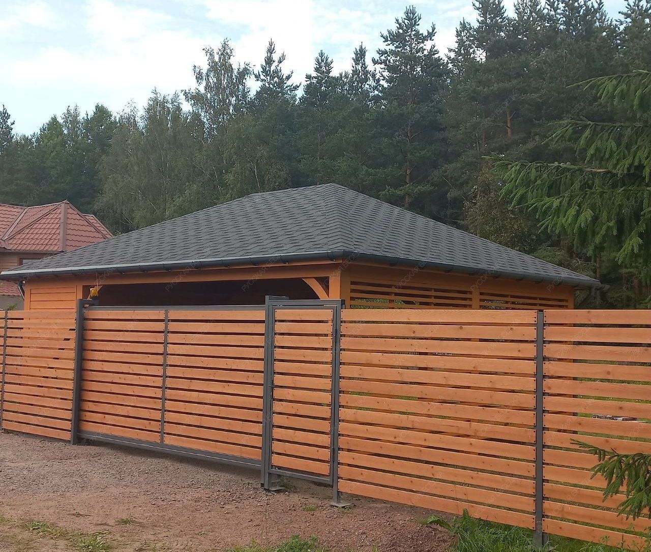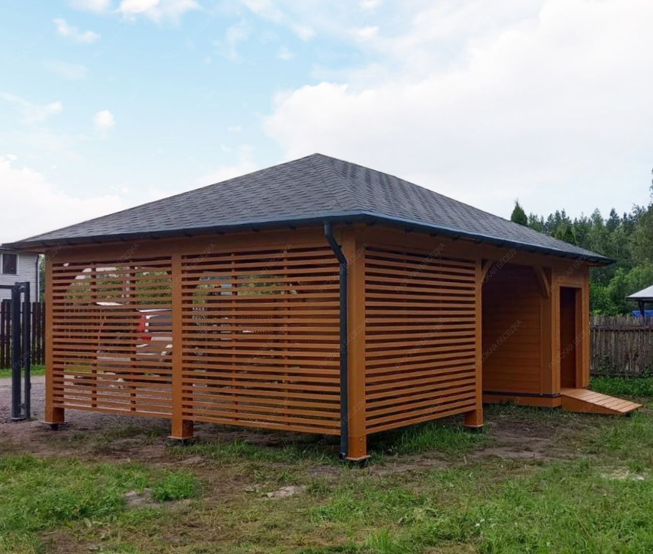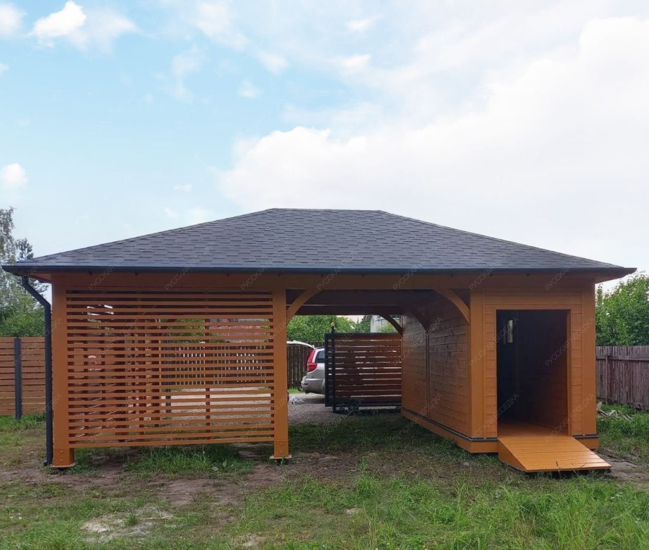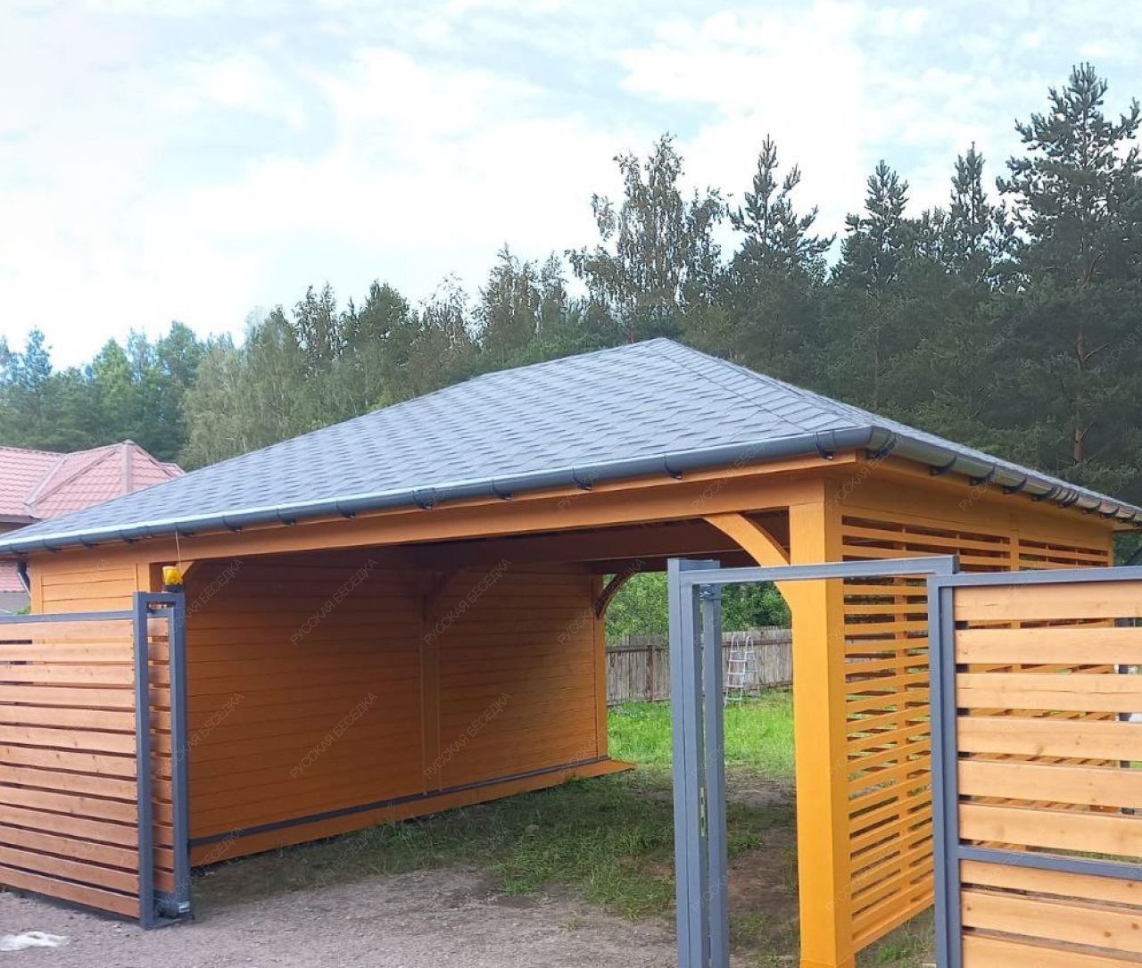 Навес из дерева послужит отличным парковочным местом для одного или нескольких автомобилей.