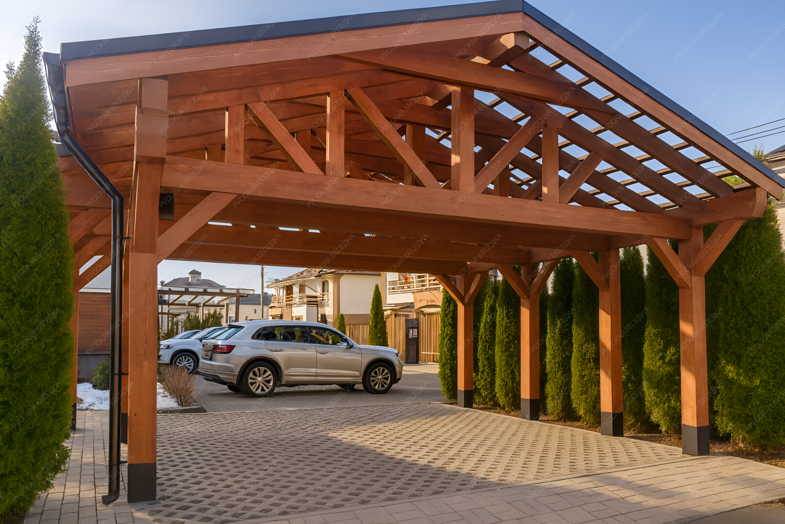 Навес из дерева послужит отличным парковочным местом для одного или нескольких автомобилей.
