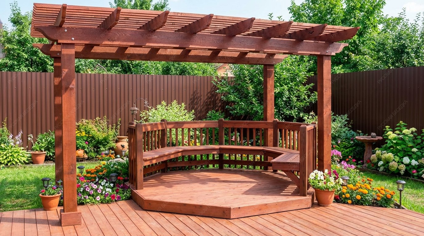Деревянная пергола придаст вашему садовому участку теплую и уютную атмосферу.Также пергола может служить опорой для плетущихся растений - только представьте, как приятно находиться в окружении цветущего клематиса или пышных роз! Дополнительные элементы, такие как встроенное освещение, декоративные решетки, качели или скамейки, могут усилить визуальный эффект и создать еще более комфортное пространство. А если в конструкцию перголы добавить подиум, то он может служить местом для расслабления или стать сценой для семейных мероприятий.