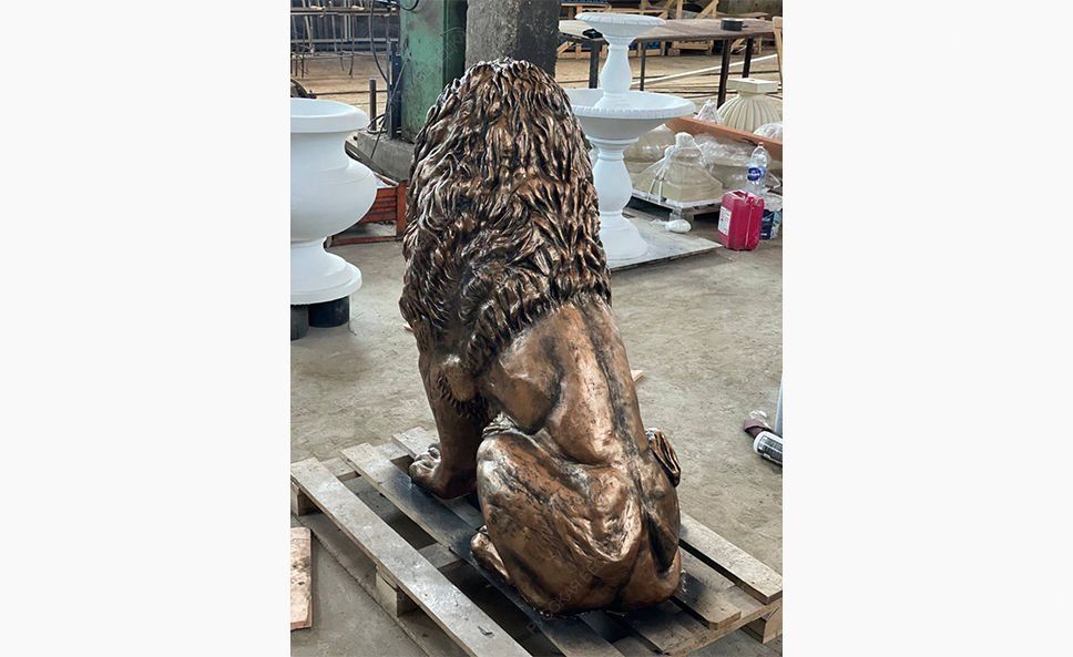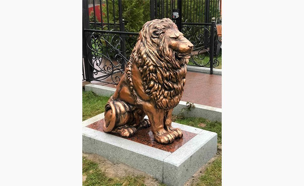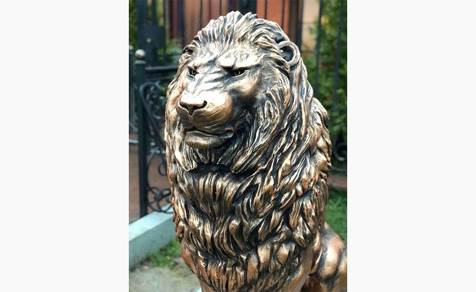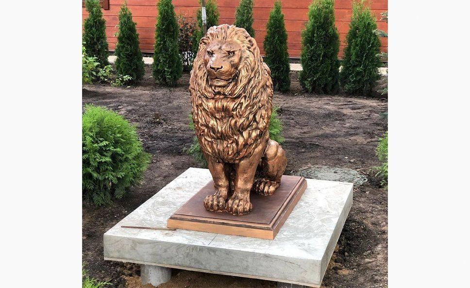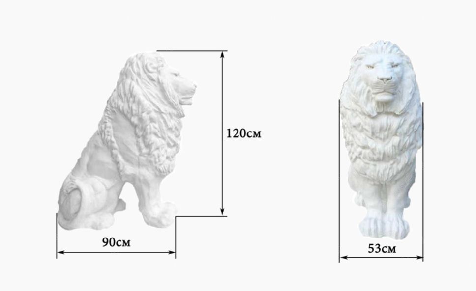 Скульптура выполнена из архитектурного бетона по технологии вибролитья. Изделие после отливки шпаклюется и красится фасадной краской со сроком службы до 20 лет. Доступны любые варианты покраски – золото, бронза, античная бронза, черный, белый и т.д. Лапы армируются. Стоимость и размеры указаны для самой скульптуры. Подставка предлагается отдельно.                 Скульптура имеет внушительные размеры, благодаря которым она отлично вписывается в экстерьер больших домов, с широкими лестницами и роскошными входными группами. Вес скульптуры (500 кг) позволяет устанавливать её на любую ровную поверхность без необходимости дополнительного крепежа. Нижняя часть плоская и широкая. Передние лапы соединены и представляют собой одну мощную точку опоры. Льва невозможно сдвинуть, столкнуть, уронить без спец. техники. Даже самые активные гости в разгар самого бурного веселья не в силах потревожить этого зверя.                                                                                                     Садовая скульптура льва – это один из наиболее давних приёмов украшения домов, усадеб, садов и гостиниц. Лев всегда ассоциируется с властью, силой, благородством и храбростью. Даже на Спасской башне по сторонам циферблата сидят каменные скульптуры львов. Наибольшую популярность садовые скульптуры львов приобрели в эпоху Классицизма. Ими украшали входные группы, пилоны ворот, стены и двери.