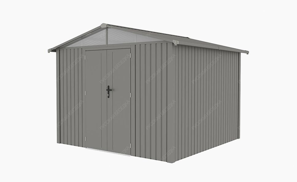 Сарай металлический, из оцинкованной стали: Панели из горячеоцинкованной стали толщиной 0,4 мм Рама из горячеоцинкованной стали толщиной 0,5-1,2 мм Комплектация:  Система быстрого отвода дождя Открывающееся окно Дополнительные оконные проемы под крышей Распашные двери, запирающиеся на замок