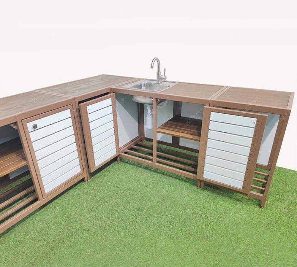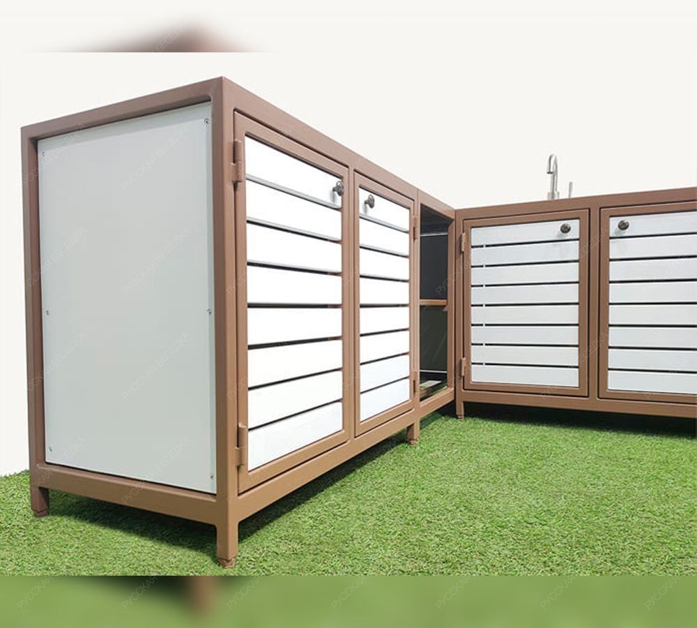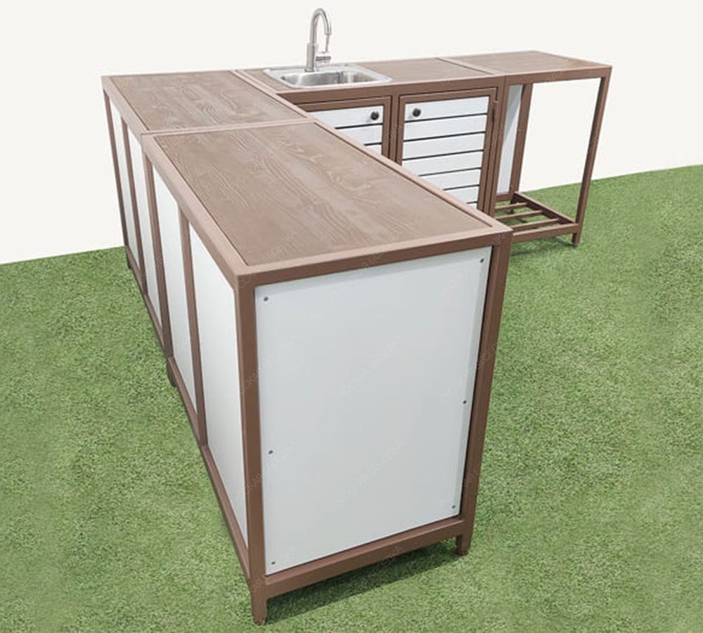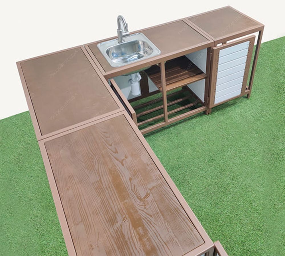Если добавить модули с печью и мангалом - то получится полноценная, всепогодная кухня барбекю.